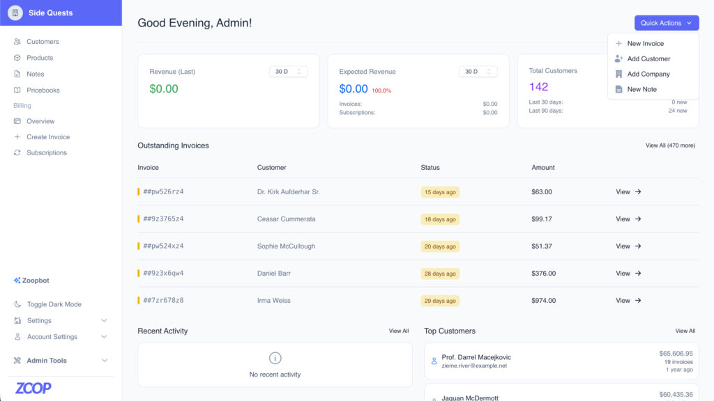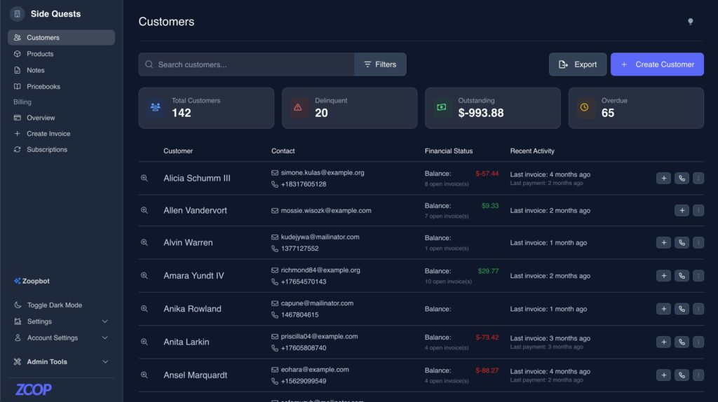 Stop chasing checks. Manage your entire client relationship—from the first quote to the final payment—in one simple hub. Zoop is a billing-first Field Service CRM.